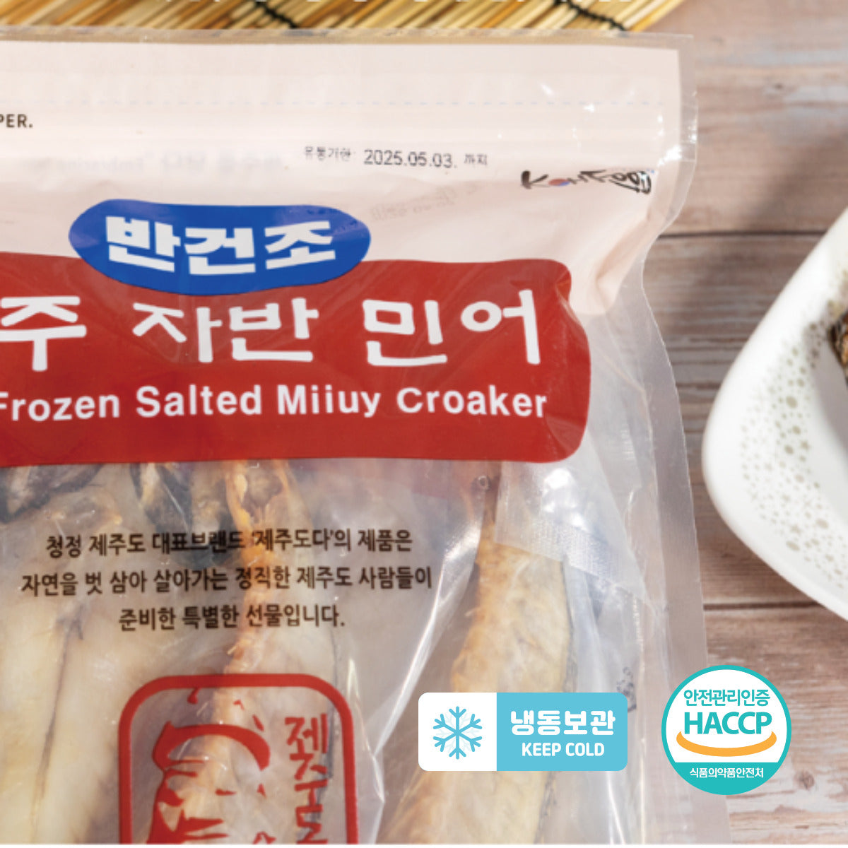 本产品采用济州岛纯净水域捕捞的野生黄花鱼制成,经过盐渍和半干燥处理,以增强风味和口感。