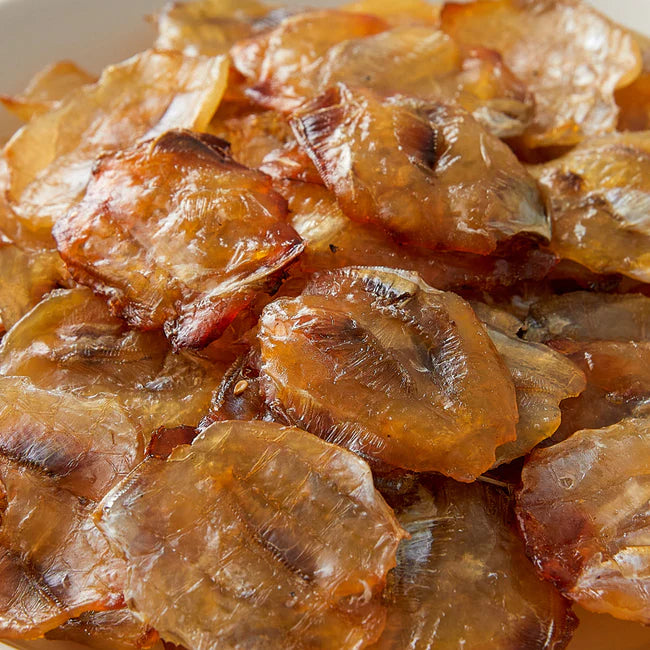 - 一口大小的小块鱼干,甜咸调味